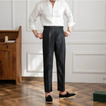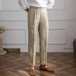 These pleated linen trousers offer a sophisticated and airy option for men seeking a refined look during the warmer months. The natural linen fabric provides exceptional breathability and a distinct texture, while the classic pleats at the waist add a traditional touch of volume and comfort. Finished with a clean cuffed hem, these trousers strike a perfect balance between relaxed summer style and tailored elegance, making them ideal for destination weddings, upscale coastal outings, or smart-casual office wear.